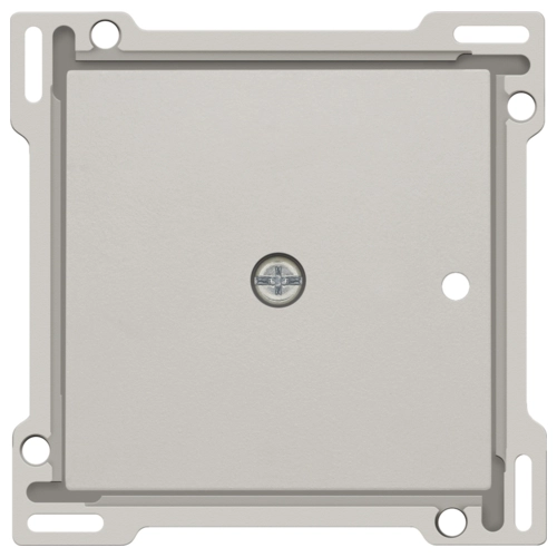 Afwerkingsset voor 1-kanaals inbouw RF-ontvanger met enkelpolig (potentiaalvrij) schakelcontact of inbouw RF-ontvanger met rolluikfunctie, light grey. De centraalplaat is omringd door een vlakke boord die op de 4 hoeken voorzien is van een rechthoekige opening, waarin zich telkens een multipositionele snaphaak bevindt. De opbouw van de centraalplaat zorgt ervoor dat bij onzorgvuldig pleisterwerk de afdekplaat steeds vlak tegen de muur bevestigd kan worden dankzij de snaphaken. Dit werkt in twee richtingen: als de inbouwdoos uit het pleisterwerk steekt, vangen de multipositionele snaphaken een speling tussen 1 à 1,2 mm op; als de inbouwdoos te diep in het pleisterwerk verzonken is, dan kunnen de snaphaken een speling tot 1,8 mm opvangen. De vlakke boord rondom de centraalplaat bevat eveneens 4 ronde openingen die ervoor zorgen dat de afdekplaat correct gepositioneerd kan worden ten opzichte van de centraalplaat. Na montage van het geheel (afdekplaat, afwerkingsset en mechanisme) zijn er, dankzij de vlakke boord aan de centraalplaat, geen metalen delen zichtbaar.