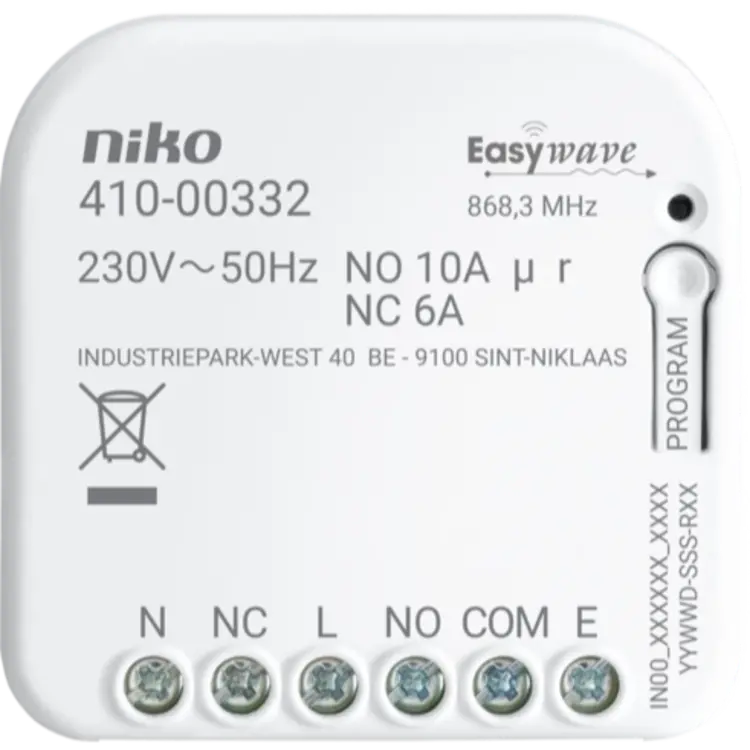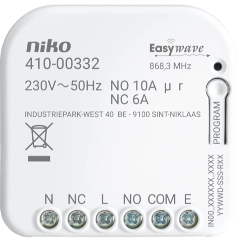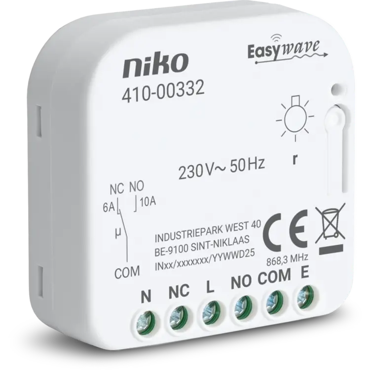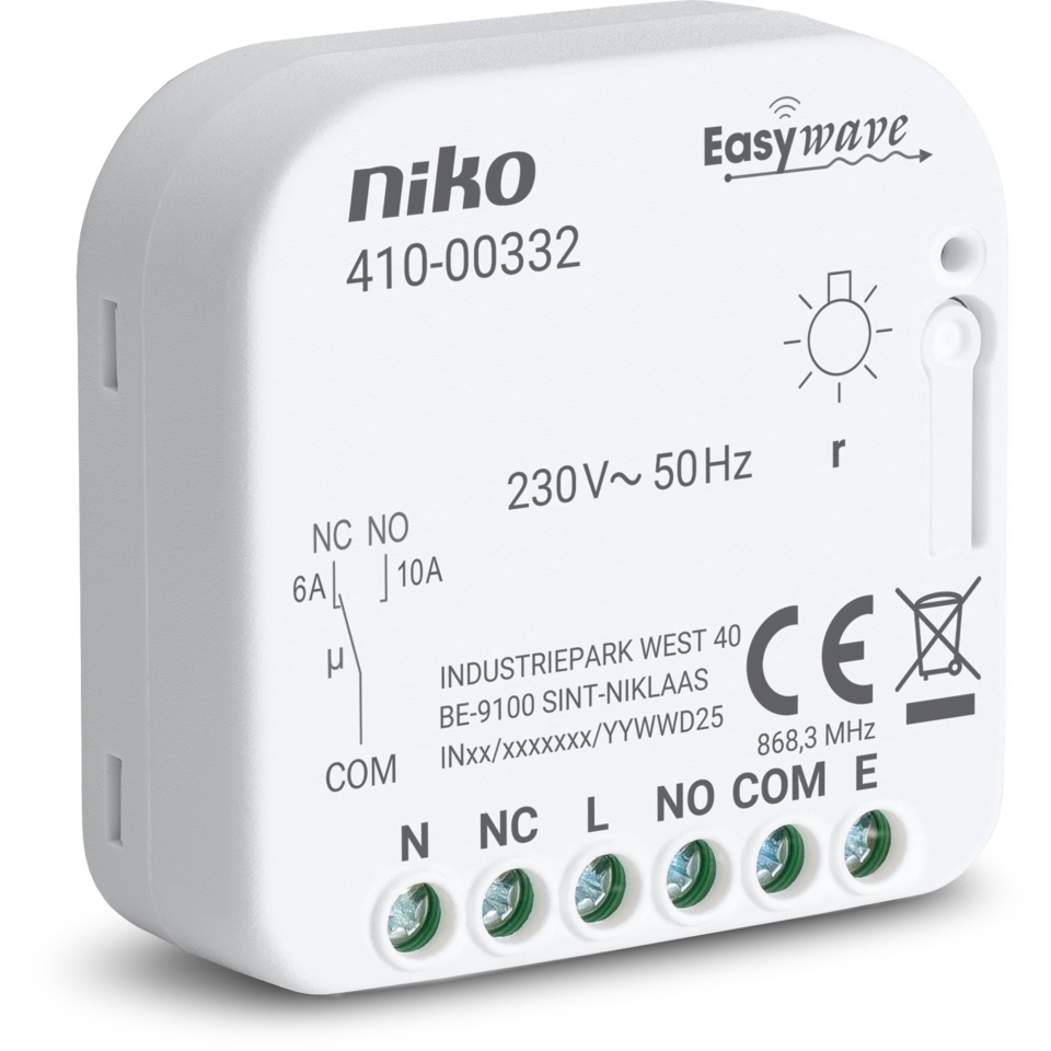 RF-ontvanger met potentiaalvrij wisselcontact voor draadloze bediening via Easywave. Voor inbouw achter schakelaars of in dozen (min. 50 mm diep). Geschikt voor bv. belfuncties of verlichting. Werkt met Niko Easywave-zenders. 230 V, 10 A.