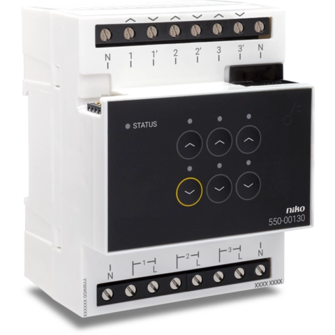 Motormodule voor Niko Home Control. De motormodule stuurt drie toepassingen aan die door een motor worden aangedreven, zoals rolluiken, gordijnen of zonweringen.